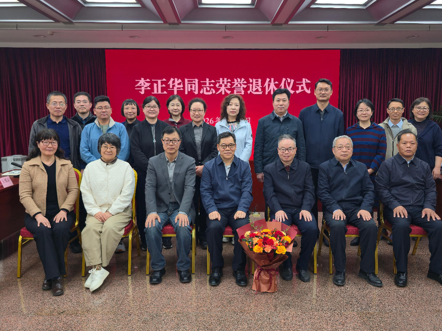 发言结束后,金民卿同志为李正华同志颁发荣誉退休证书、送上鲜花,全体参会人员与李正华同志合影留念,活动在庄重温馨的氛围中落下帷幕。