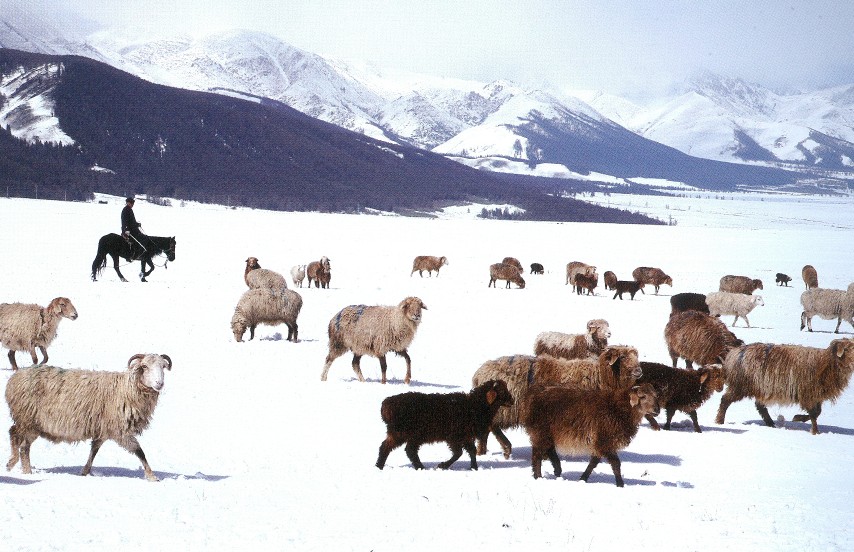 2009年5月,新疆哈密牧民在银装素裹的草原上放牧。