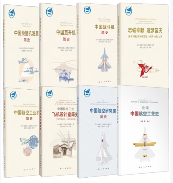 该丛书共八册,分别是《中国预警机发展简史》《中国直升机简史》《中国战斗机简史》《忠诚奉献 逐梦蓝天:新中国航空事业发展70周年70件大事》《中国航空工业机载简史》《中国航空工业飞机设计室简史(1956年8月-1961年7月)》《中国航空研究院简史》《极简中国航空工业史》。